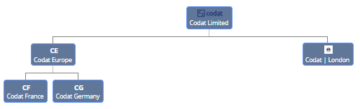 That same hierarchy would be 5 different companies on the Codat platform. CompanyCompany In Codat, a company represents your customer's business entity. Companies can have multiple connections to different data sources. 1: Codat Limited CompanyCompany In Codat, a company represents your customer's business entity. Companies can have multiple connections to different data sources. 2: Codat Europe CompanyCompany In Codat, a company represents your customer's business entity. Companies can have multiple connections to different data sources. 3: Codat France CompanyCompany In Codat, a company represents your customer's business entity. Companies can have multiple connections to different data sources. 4: Codat Germany CompanyCompany In Codat, a company represents your customer's business entity. Companies can have multiple connections to different data sources. 5: Codat | London